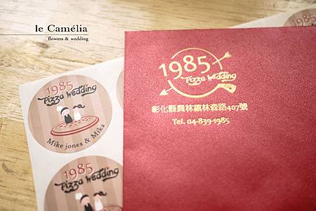 喜帖信封為了迎合長輩選擇了紅金配色,上面的地址就是1985Pizza,靠近彰化的朋友們可以去捧個場