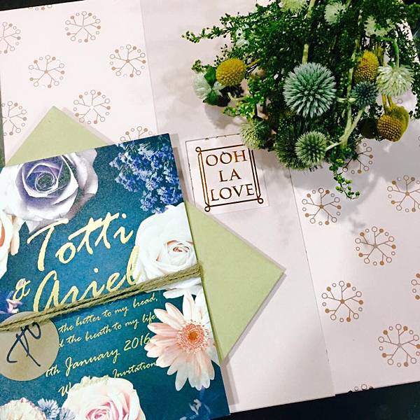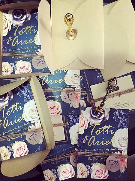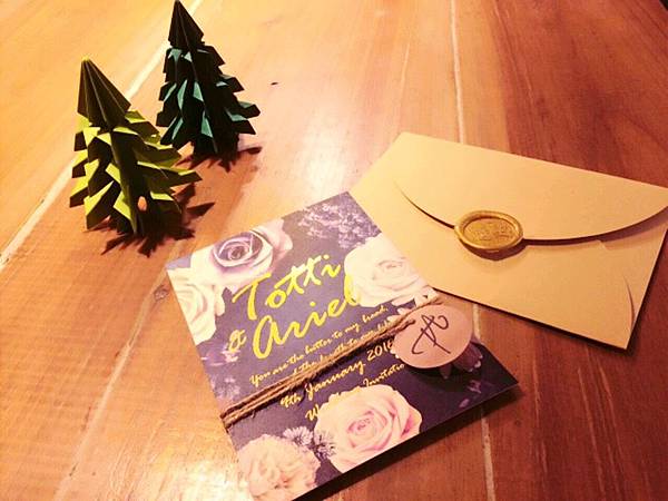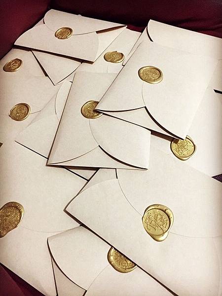 特別訂製的牛皮色花瓣信封呼應喜帖要傳達的文藝個性,交貨幾天後Ariel回傳她完成封蠟和綁繩的整套照片,霧金色的訂製蠟印復古又精緻,超符合這份婚卡想要傳達的文藝個性風((尖叫個不停)