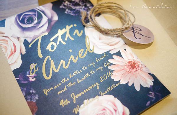 山茶花小姐默默決定以後都用新人的名字縮寫來為喜帖命名,喜帖設計的過程就像孩子的誕生,一起討論並且期待那一刻的相間,不僅是紀念新人初次見到喜帖的感動,對於即將初老的山茶花也是一個能夠牢牢記住美好回憶的依據XD