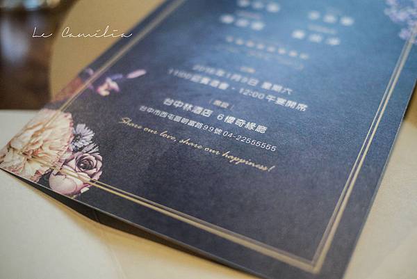 ♥ 訂購最低數量為100份,增加數量以50份為單位,顏色風格、專屬LOGO、紙張材質、燙金、 凹凸板印刷、緞帶、麻繩、乾燥花葉、水鑽、雷射雕刻、木頭喜帖、訂做信封、各式各樣的有趣加工都可以為您實現,但是需要和山茶花小姐約個時間見面討論,才能夠詳細的為您估價。