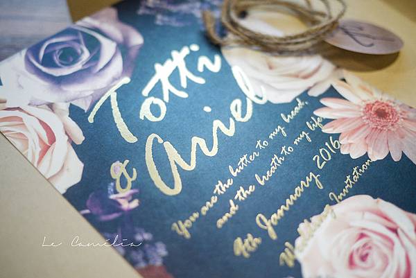 紙材選用頂級象牙卡,420g的厚磅數拿起來格外紮實,卻又不會造成重量上太多的負擔。為了維持個性感覺,正面燙金使用霧面金箔,減低燙金的華麗感,隨興的英文書寫出兩人的品味。